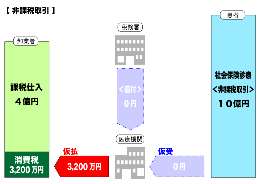 仮に社会保険診療(非課税)が10億円の医療機関の場合、仮受消費税はゼロ円です。しかしそれに対し4億円の仕入れをした場合、仮払消費税は3,200万円となります。
