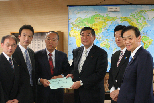 石破茂政務調査会長に本四高速道路値上げ反対など兵庫県が抱える問題に対する陳情書を手渡す自民党兵庫県連の県議団。左から上田良介(美方郡),藤田孝夫(養父市),小田毅(加西市)の各県議